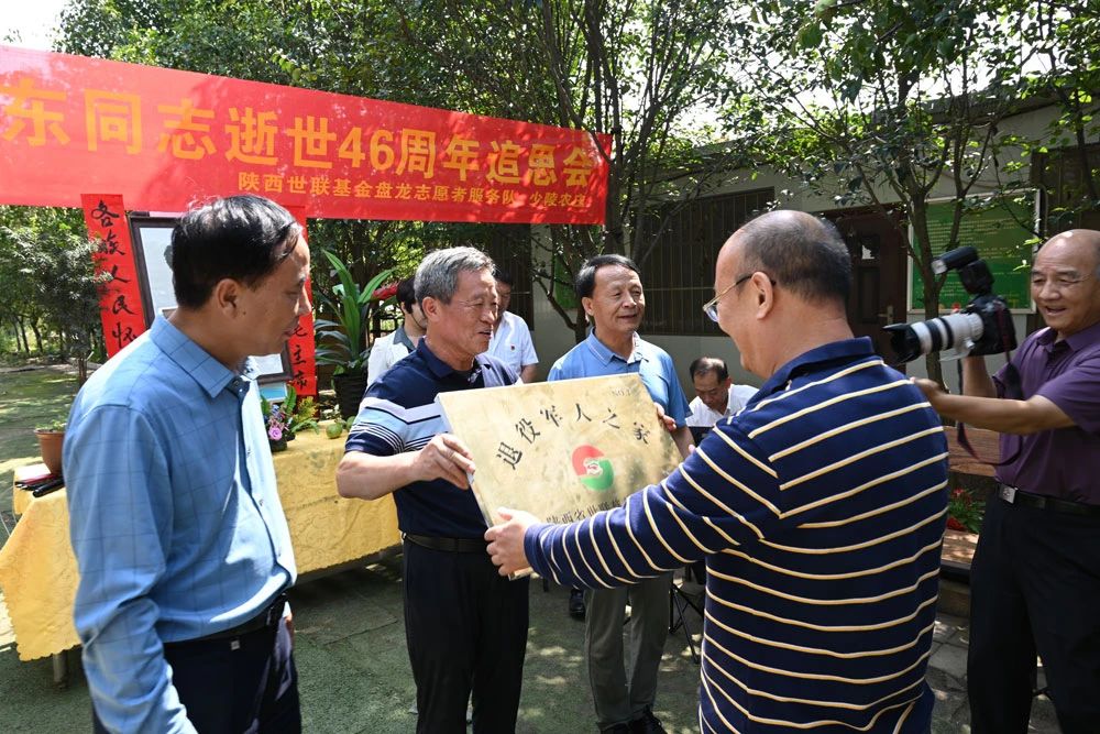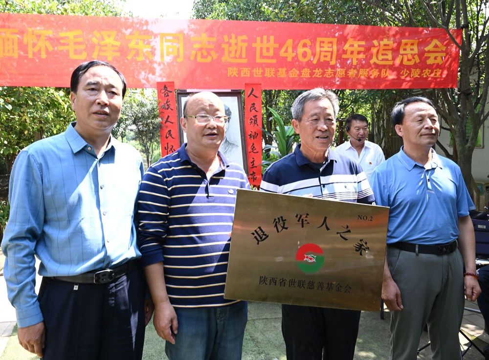 王卫宏、蒋宏权、邓博会长代表陕西省世联慈善基金会向少陵农庄颁发“退役军人之家”牌匾。